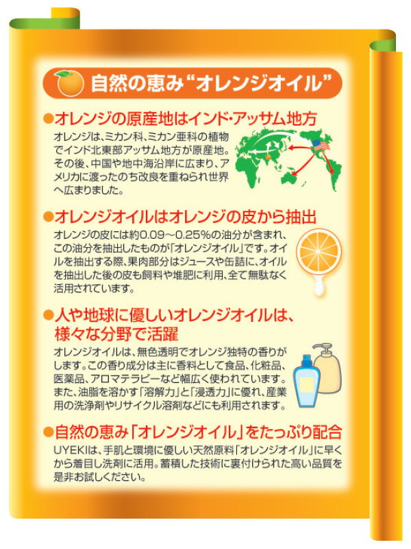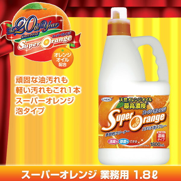 UYEKI(ウエキ) スーパーオレンジ消臭・除菌泡タイプ 業務用 1.8L 本体サイズ 内容量:1.8L 材質 オレンジオイル、界面活性剤 仕様 ●原産国:日本 商品説明 ●油汚れに浸透して浮かせて落とすオレンジオイルをたっぷり配合●液だれしにくい泡スプレータイプ●軽い汚れには50倍や200倍に薄めて使用できるので経済的(目安として、汚れのひどい電化製品には約50倍、ヤニやホコリなどの軽い汚れは約200倍)●手肌にやさしく、かつしっかり汚れを落とす、天然のオレンジオイルと天然のヤシ油由来の界面活性剤を使用●消臭・除菌も同時にできるので、グリルや浴室などの臭い・雑菌が気になるところにも大活躍※すべての臭い・菌を除去するわけではありません※この商品は、2019年12月17日よりパッケージ変更をしております 商品補足説明 YAMAZEN ヤマゼン 山善 通販 UYEKI ウエキ 洗剤 掃除用洗剤 オレンジオイル オレンジクリーナー オレンジ 油汚れ ガンコ汚れ キッチン 調理場 空調 浴室 洗面所 トイレ スプレー 泡 業務用 除菌 消臭 多目的洗剤スーパーオレンジ シリーズ 掃除・洗濯用品 ランキング